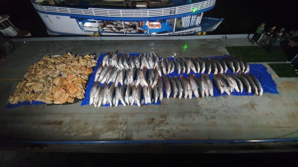 Por volta das 4h30 de terça-feira, as equipes aprenderam cinco toneladas de pirarucu fresco e sete toneladas de pirarucu salgado, que estavam armazenados em sacos plásticos, acondicionados em meio a gelo, também no porão do barco.