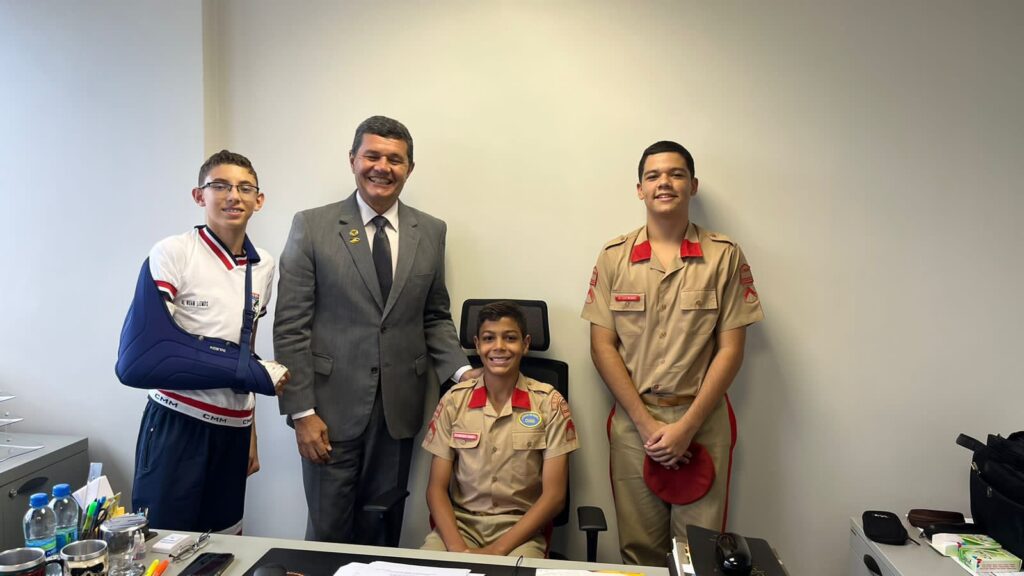 POLÍTICA – O deputado Dan Câmara (PSC) recebeu em seu gabinete alunos do sétimo ano do Colégio Militar de Manaus (CMM), mantido pelo Exército brasileiro. Acompanhados de seus responsáveis, Caio Mendes, de 14 anos, Mateus Amaral e Ruan Lemos, ambos com 13, procuraram o parlamentar para uma pesquisa da disciplina de Artes, sobre patrimônio imaterial.
