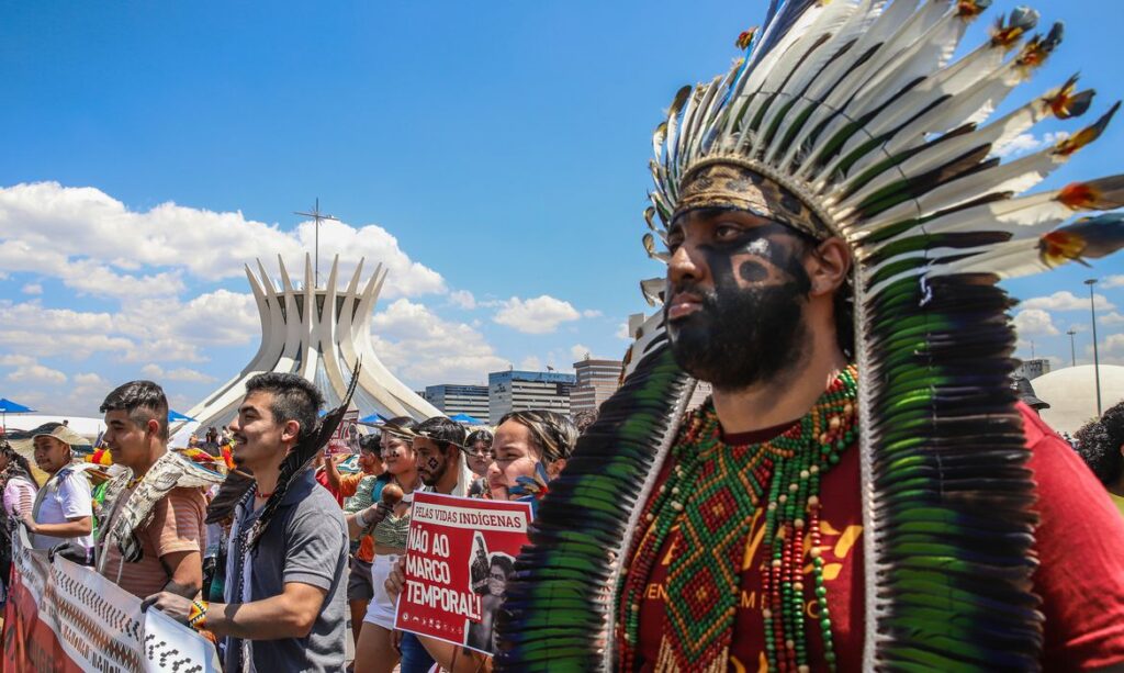 Para acompanhar o julgamento no STF, indígenas estão mobilizados em Brasília. Eles também se manifestam contra a tentativa do Senado de legalizar o marco temporal.